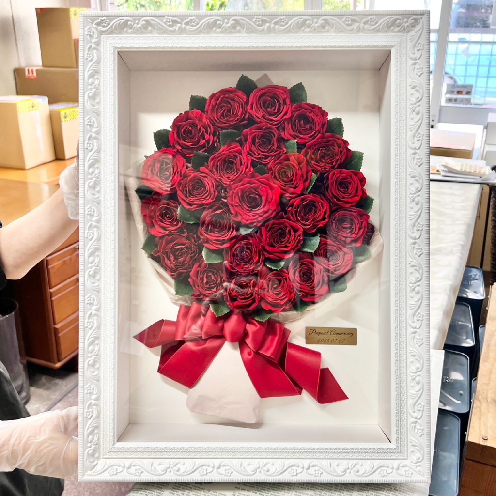 ホーム > ギャラリー > A3額フレーム A3額フレーム A3サイズの額フレームに使われていたラッピングと一緒に花束を再現したデザインです。(先頭画像はクラッチブーケ風タイプ) 大きく飾ることができてインパクト抜群! サイズ:H492×W369 フレーム・追加資材費:21,000円(税込23,100円) フレーム色:白色 / 銀箔色 壁掛け ※クラッチブーケ風の場合、+2,000円(税込2,200円)となります。 大サイズの薔薇50輪